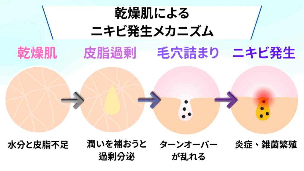 - 乾燥で皮脂分泌が増え毛穴が詰まりやすい。