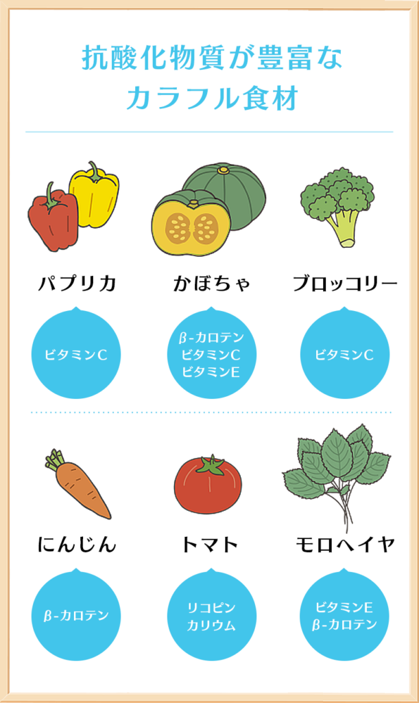 - 抗酸化食材(ビタミンC・E、ポリフェノール、緑黄色野菜など)を積極的に。